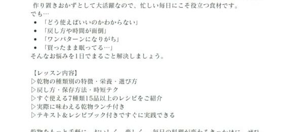 皆さまこんにちは アン料理教室 みゆきです 9月に1 day レッスンとして「乾物 レッスンの基礎編」を開催いたします 乾物は昔ながらの知恵がつまった保存食です常温保存ができ、栄養たっぷりで、調理も簡単忙しい日々の食卓でこそ、大活躍してくれる頼もしい食材です。 「戻…