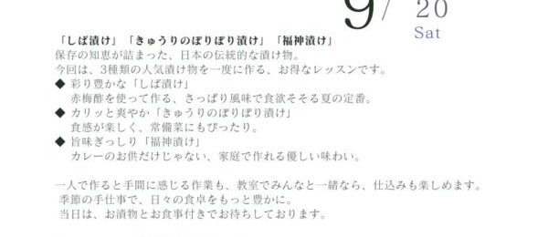 皆さまこんにちは アン料理教室 みゆきです 8月に開催しました「漬物レッスン」 ご好評により、「9月にも」開催することになりました! 一日で、3種類のお漬物を学べるお得なレッスンです 冷蔵庫にひとつあるだけで、毎日の食卓が豊かになるお漬物。初めての方にも楽しんでいただ…